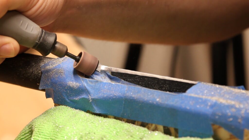 Once the basic shape was in place, I moved on to the sanding drum to knock down any “hills” I might have created. The drum probably isn’t the most ideal bit for “carving” the aluminum receiver, as it is a 120 grit sanding band coated with aluminum oxide. Still, the larger diameter 1/2″ drum was helpful in smoothing things out and put on a pre-finish.