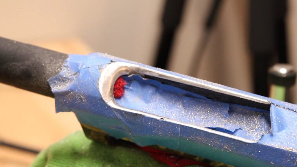 My first step was to disassemble the shotgun and use the masking tape to mark off how much material I wanted to remove. It is important not to affect the legibility of the serial number, and avoid carving out any material beyond the edge of the trigger housing.